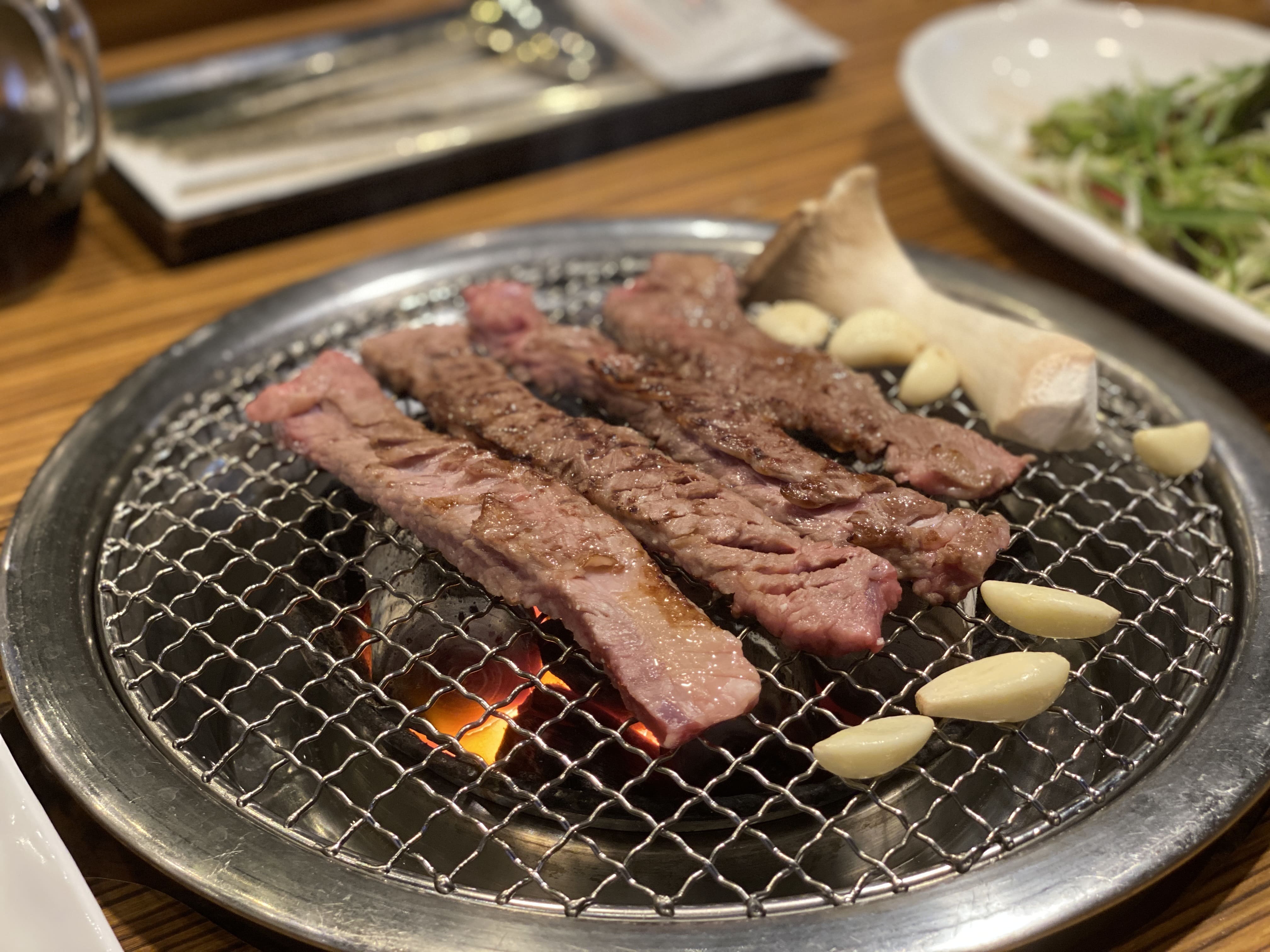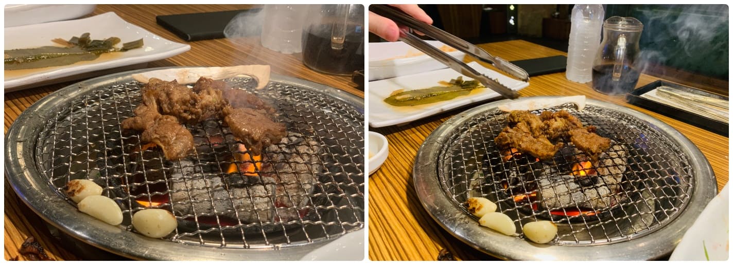 갈비 소금구이와 양념갈비입니다. 참숯에 구워서 정말 맛있습니다. 역시 소고기는 숯에 구워 먹어야 되는 것 같습니다. 스테이크도 너무 좋아하긴 하지만 역시 참숯에 구워 먹는 소고기가 최고인 것 같습니다. 소고기가 타지 않게 집중해서 구웠습니다.