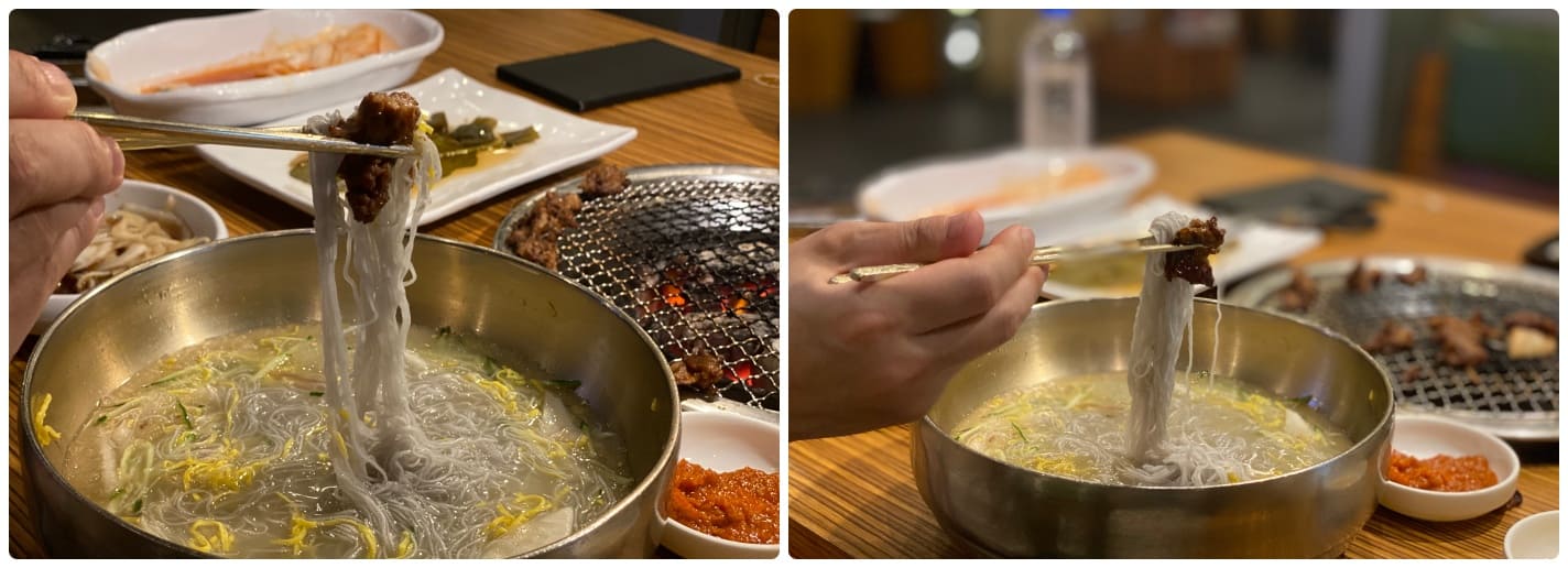 고기 먹는 중에 밀면을 시켰습니다. 양념 소고기를 싸서 먹으면 정말 맛있습니다. 이렇게 먹고 나면 배가 툭툭 두드리면서 아주 기분이 좋아집니다.
