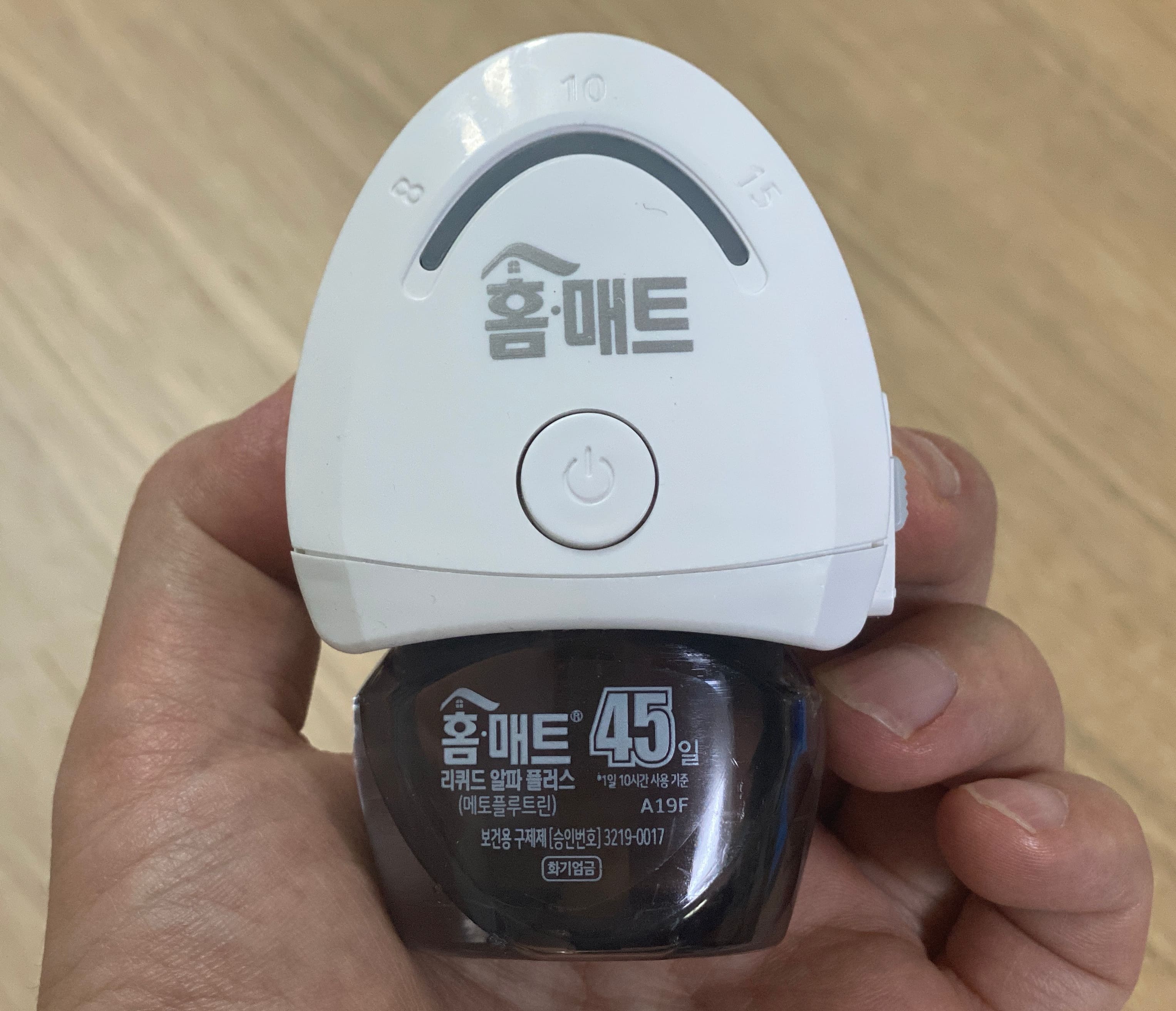 홈매트에 리필 액상 용기를 장착한 모습입니다. 한 손에 쥐어지는 크기입니다. 전원 버튼이 중간에 보입니다. 여기를 누르면 기본적으로 8시간 작동하게 됩니다. 요즘 모기를 한 번씩 마주하게 되어서 자기 전에 켜두는데요. 편안하게 잠을 잘 수 있습니다. 우측에 보시면 버튼이 하나 보입니다. 여기는 세기를 조절하는 버튼입니다. 스위치를 위로 올리면 일반 모드(+) 아래로 스위치를 내리면 약 모드(-)입니다.